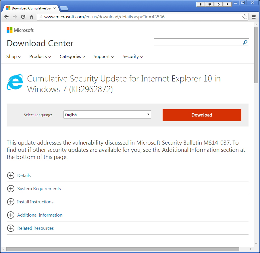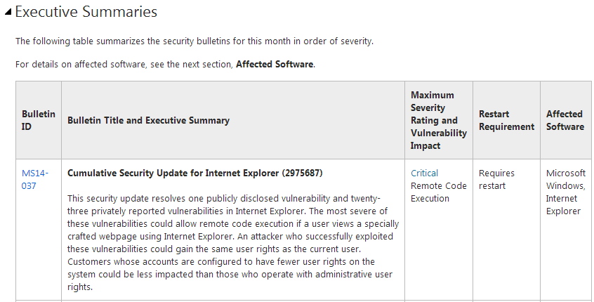 - Click the link in the Bulletin ID field. The Security Bulletin for that patch opens. In this example, Security Bulletin MS14-037 opens: