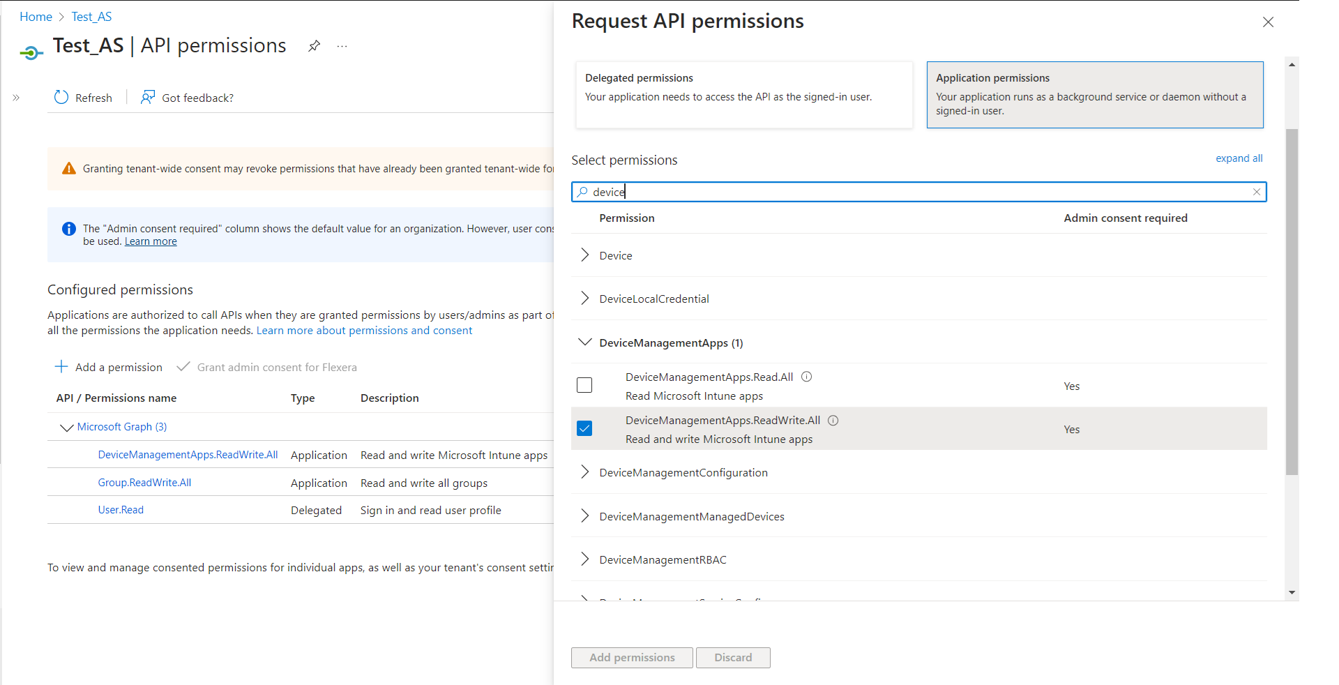 6. Under DeviceManagementApps select DeviceManagementApps.ReadWrite.All and click Add permissions .