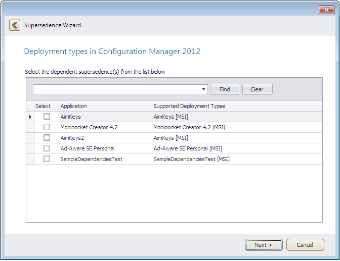 On the Deployment Types in Configuration Manager 2012 panel, select dependent supersedences from the list of applications from Configuration Manager 2012.