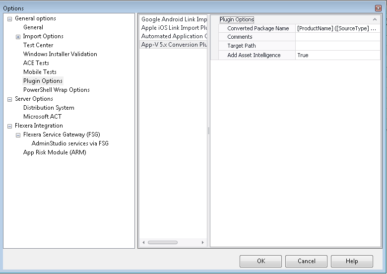 3. In the middle pane, select App-V 5 Conversion Plugin . The App-V 5.0 conversion options are displayed in the right pane.