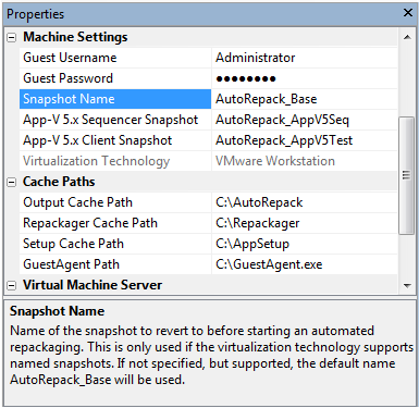 AutoRepack_Base, after you add the virtual machine to the Automated Application Converter, you need to enter that snapshot name in the Snapshot Name field in the Properties window of the Machines tab for that virtual machine.