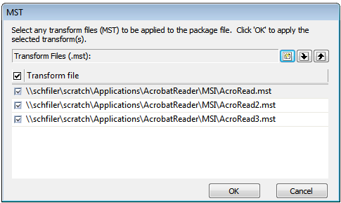On the MST dialog box, specify how transforms should be handled for the selected Windows Installer package: