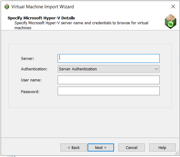 AuthenticationSelect one of the following options: Server Authentication—Select this option if you want to connect to the Hyper-V Server using a User name and Password that you specify. Windows Authentication—Select this option to use the credentials of the logged in user to login to the Hyper-V Server.