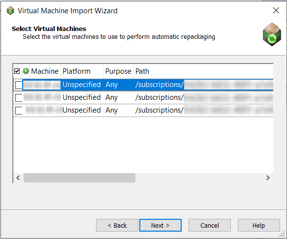 | Selection column. To select a virtual machine to use for automated repackaging, click the check box in this column. | |