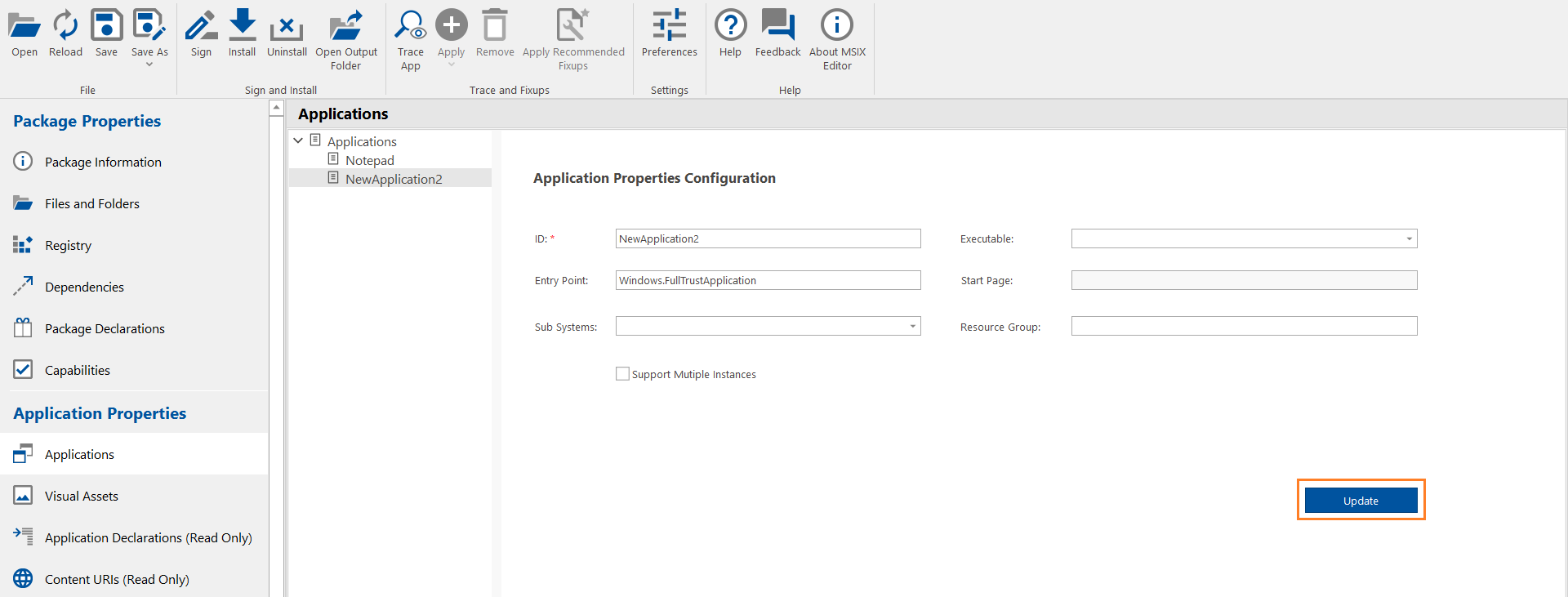 - Enter the details in the respective fields and then click Update button. For more information on Applications properties, see Applications View.