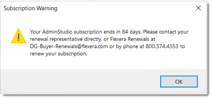The following message will be displayed upon expiration of the subscription. Clicking OK will be close AdminStudio.
